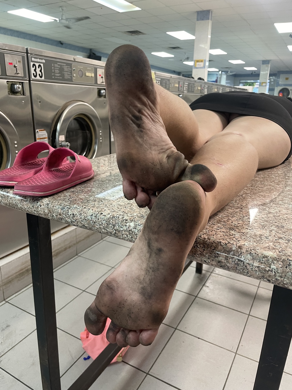 In this clip, meet Bobby Jo Of Memphis TN dead center..I ran down on her as she was frolicking up the street...She had on some pink slides that appeared to be too small for her FEET..She was short but her FEET were a size 8...Watch in this clip, as she gets her filthy SOLES Interviewed after being marched to the laundromat...Her SOLES are excellent..She lays on the laundry table and more..THIS CLIP IS A CLASS FIRE